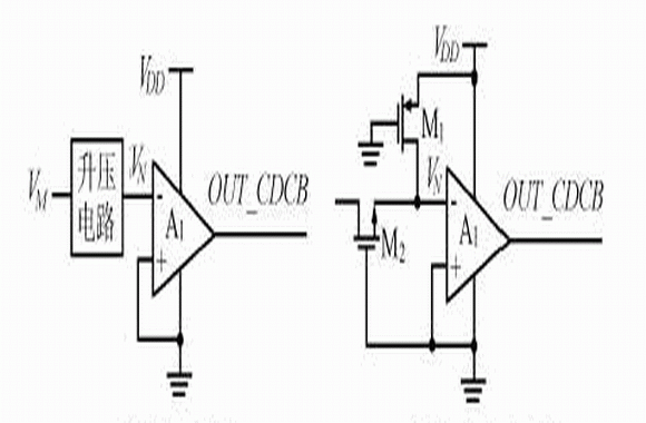 充電過流的檢測歸結(jié)為檢測VM電壓,其臨界值為VCH(約為-1.3V)。如果所用工藝的MOS管閾值電壓可以調(diào)節(jié),負(fù)電壓檢測電路可用差分結(jié)構(gòu)的比較器實現(xiàn),其中比較器的一個輸入端接地,并且兩個差分對管的閾值電壓需要調(diào)整。為了使該電路能用常規(guī)的CMOS 工藝實現(xiàn),本文在過零比較器的基礎(chǔ)上引入升壓電路,如圖6(a)所示當(dāng)VM》VCHA時,升壓電路使VN>0 。升壓部分具體實現(xiàn)如圖6(b)所示。