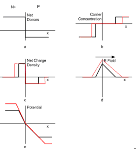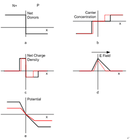 二極管的特性可以通過如圖1所示的突變型PN結(jié)來做深入理解??紤]到兩片硅材料,一片是重?fù)搅耸┲麟s質(zhì)的n+硅,一片是輕摻了受主雜質(zhì)的p硅。如圖1a所示那樣我們?cè)趚=0處將它們結(jié)合。n+區(qū)域電子密度等于施主雜質(zhì)的數(shù)目,而P區(qū)域認(rèn)為空穴密度等于受主雜質(zhì)濃度,但這種靜態(tài)情況將不會(huì)持續(xù)。在PN結(jié)邊界處電子將和空穴重新結(jié)合,結(jié)果是導(dǎo)致在PN結(jié)連接處的區(qū)域電子和空隙全被耗空。這就是圖1b所示的耗盡層,或者說是零載流子濃度區(qū)域。在這個(gè)連接處區(qū)域隨著載流子濃度的耗盡就成為靜電荷區(qū)域,如圖1c。在橫坐標(biāo)零點(diǎn)左邊,由于電子和右邊的空穴中和從而只剩下帶正電的靜電荷;在零點(diǎn)右邊,由于空穴和左邊的電子中和從而只剩下帶負(fù)電的靜電荷。在PN結(jié)連接處的兩邊耗盡區(qū)的寬度依賴于兩邊施主雜質(zhì)和受主雜質(zhì)各自的摻雜濃度。有個(gè)物理現(xiàn)象是PN結(jié)耗盡區(qū)總的正電荷數(shù)和負(fù)電荷數(shù)一樣,所以PN總體還是呈現(xiàn)不帶電狀態(tài)。 PN結(jié)連接處摻雜濃度高的一邊的耗盡層寬度比摻雜濃度低的一邊要窄得多。 耗盡區(qū)一定的靜電荷密度的存在產(chǎn)生了一個(gè)電場(chǎng),其場(chǎng)強(qiáng)最大的地方是PN結(jié)連接處,如圖1d所示。PN結(jié)的電場(chǎng)存在產(chǎn)生了內(nèi)建電壓差,如圖1e所示。電場(chǎng)和電壓的存在會(huì)迫使電子向n區(qū)域移動(dòng),而空穴向p區(qū)移動(dòng)。