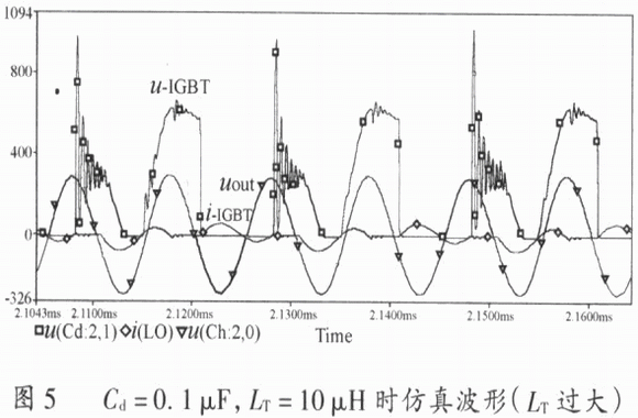當(dāng)LT過(guò)大時(shí),電路工作時(shí)存在以下缺點(diǎn):LT上的高頻壓降過(guò)高,使得輸出電壓降低;管子關(guān)斷時(shí)承受的正向阻斷電壓升高;內(nèi)槽路諧振頻率減小,IGBT和二極管出現(xiàn)二次導(dǎo)通,如圖5所示。
