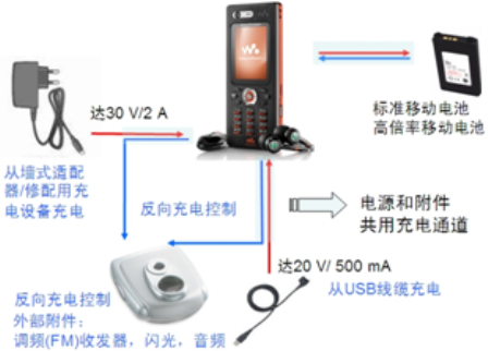 我們把普通墻式適配器或USB充電適配器到移動(dòng)設(shè)備電池的通道稱為直接充電通道,而把移動(dòng)設(shè)備電池到外部附件(如調(diào)頻收發(fā)器、負(fù)載揚(yáng)聲器和閃光模塊)的通道稱為反向供電/充電通道(參見圖1移動(dòng)設(shè)備的直接充電通道和反向供電/充電通道示意圖)。