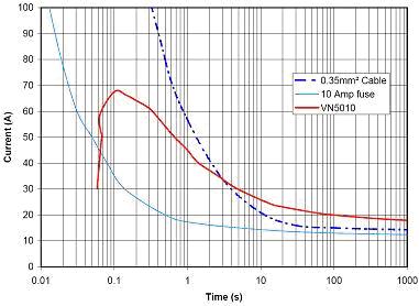 在圖5的示例中有一個點,智能開關(guān) (VN5010)將繼續(xù)前行,而電線將開始自毀(紅線在藍(lán)色虛線上方)。如果這種情況是真實的,甚至連電路板都可能會自毀。現(xiàn)在考慮到涌流要求很可能更加嚴(yán)格,我們開始意識到有必要開發(fā)一個能夠仿真熔斷器特性的保護(hù)算法。