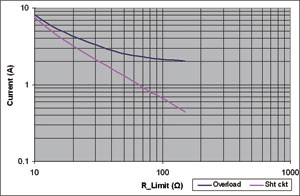 圖2展示NIS5132的一對曲線。導(dǎo)通較低的曲線時,激活的是短路曲線。一旦電流降低至低于這個電平,F(xiàn)ET就完全導(dǎo)通(線性區(qū)域),接下來面對的就是過載電平。如果電流達(dá)到過載電平,F(xiàn)ET的柵驅(qū)動將立即減小,而漏極至源極電壓將增加,并會將工作模式改為短路電平模式。這器件在過載電平時不能維持穩(wěn)態(tài)工作。