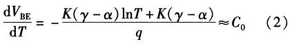 如果忽略由溫度變化引起lnT項(xiàng)變化對(duì)式(2)的影響,dVBE/dT可近似等于常數(shù)C0。常溫下C0約為-2 mV/K。為了簡(jiǎn)化計(jì)算,則PN結(jié)關(guān)于溫度的變化方程可近似線性為