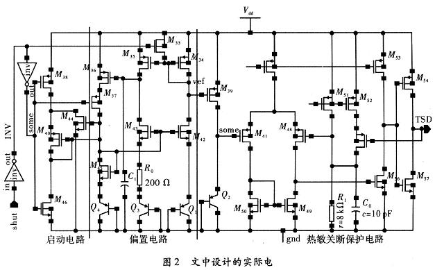 圖1為本設(shè)計(jì)的原理架構(gòu),Q1為NWELLCMOS工藝中寄生PNP三極管,其集電極是必須與地點(diǎn)位連接,為了利用寄生PN結(jié)導(dǎo)通正向?qū)妷旱呢?fù)溫度特性,把Q1做二極管連接(基集也接到地),這樣A點(diǎn)和地之間的電壓VA就具有了PN結(jié)正向電壓的與溫度成反比的性質(zhì)。由于基準(zhǔn)電路輸出的偏置電壓加在M0、M1、M5的柵極上,則其所在支路上都會(huì)產(chǎn)生PTAT電流(Proportional to Abso-lute Temperature);在提供偏置的同時(shí),也在電阻R0上產(chǎn)生了與溫度成正比的電壓VB即B點(diǎn)電壓隨之增大。當(dāng)達(dá)到某一溫度TH(設(shè)定的關(guān)斷溫度)后,VH≥VA、比較器Comp輸出高電平,經(jīng)過(guò)倒相器INV后,輸出TSD為低電平;此信號(hào)作用于電路的其它模塊后,使整個(gè)芯片停止工作,實(shí)現(xiàn)熱保護(hù)功能。同時(shí),TSD信號(hào)正反饋?zhàn)饔糜贛2柵上,開(kāi)啟M2,加大了電阻R0上電流,使VB更高。
