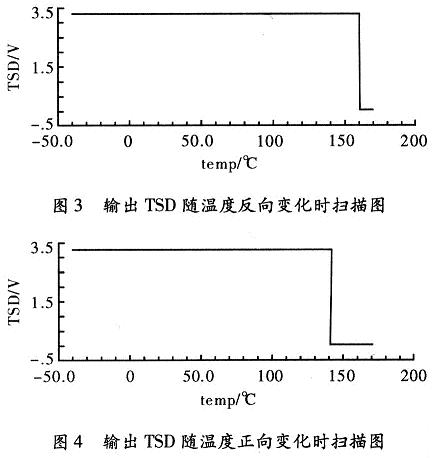 按照以上設(shè)計(jì)的電路。用Cadence Specture對(duì)其進(jìn)行仿真,器件的模型參數(shù)采用0.35μm CMOS工藝。圖2為過(guò)溫保護(hù)電路的輸出控制信號(hào)TSD,隨溫度上升和下降的曲線。電源電壓取3.3 V。從仿真結(jié)果可以看出,該電路實(shí)現(xiàn)了良好的“溫度遲滯”特性。遲滯功能有效的避免了芯片出現(xiàn)熱振蕩問(wèn)題。關(guān)斷溫度TH160°和恢復(fù)溫度TL140°。