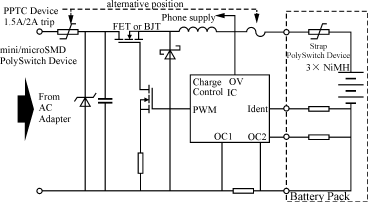 圖1是一個(gè)典型的電池充電電路。其中,交流電通過(guò)AC/DC電源適配器轉(zhuǎn)變?yōu)楹线m電壓對(duì)電池組進(jìn)行充電。PPTC元件與過(guò)壓保護(hù)元件協(xié)調(diào)作用共同完成下列工作: