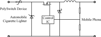 2)轉(zhuǎn)換器發(fā)生故障時(shí)的汽車(chē)電路保護(hù)如果轉(zhuǎn)換器或控制IC失效,短路電流會(huì)使PPTC動(dòng)作跳變至高阻狀態(tài),以保護(hù)汽車(chē)的線路及保險(xiǎn)絲。