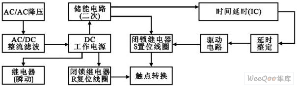 斷電延時繼電器整體構(gòu)成包括斷電延時繼電器電源部分(經(jīng)降壓、整流、濾波)以提供斷電延時繼電器內(nèi)置瞬動電磁繼電器和2繞組閉鎖型R復位線圈工作);二次電源部分(供斷電后延時部分與2繞組閉鎖型S置位線圈工作);延時工作部分(可編程定時集成或CMOS計數(shù)分頻集成);驅(qū)動部分;執(zhí)行繼電器部分組成(圖1)。