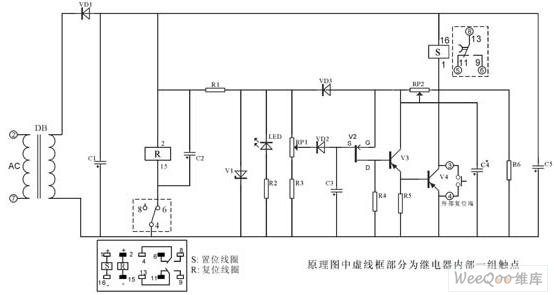 該電路核心部分由IC4541構(gòu)成,延時設(shè)定由RP2、C*設(shè)定,A-B端根據(jù)需求接相應高、低電平(設(shè)定端)內(nèi)部2繞組閉鎖繼電器采用DC12V(因繼電器工作電壓與IC4060組成延時電器要低,則為保證其驅(qū)動則分別由V6、V7、V1、V3構(gòu)成)。其中C2為二次儲能器件,可根據(jù)延時的長短予以調(diào)整,C4為完成S置位線圈工作。