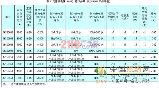 為了使LED路燈能夠滿足安全要求,氣體放電管的耐壓選擇至關(guān)重要,應該選取足夠耐壓的氣體放電管與壓敏電阻配套,壓敏電阻和氣體放電管串聯(lián)電路(如圖1)應能夠承受基本絕緣的耐壓。幾種氣體放電管的直流火花放電電壓和交流擊穿電壓的關(guān)系見表3,氣體放電管的直流火花放電電壓一般應選不低于2500V。