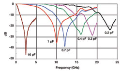 我們必須認(rèn)識(shí)到薄膜電容器用作帶阻濾波器是具有局限性的。因?yàn)楸∧る娙萜魍ǔV荒芴峁┬‰娙葜?,所以它們局限于頻率相對(duì)較高的帶阻濾波器設(shè)計(jì)。如果涉及到低頻設(shè)計(jì),必須采用其他的濾波器方法,通常是使用高Q值的多層射頻電容器。