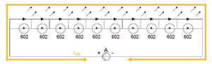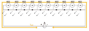 若在串聯(lián)的LED中有一個開路,如圖9所示,則與此并聯(lián)的SMD602的正、負極之間電壓大于其開啟電壓4.65~5.25V,此器件由關(guān)閉狀態(tài)轉(zhuǎn)換為導(dǎo)通狀態(tài),降壓為1~1.2V。LED電流經(jīng)SMD602內(nèi)部的晶閘管后流到下一個LED,保證其他未開路的LED正常工作。圖中用紅線X表示此LED開路。