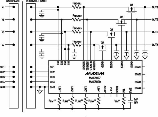 Maxim公司推出了一系列電源熱插拔控制器,適應(yīng)于各種背板電源的要求。MAX5927/5929是針對低壓電源系統(tǒng)的+1V到13.2V的四通道熱插拔控制器。在電路板熱插拔時,MAX5927/5929控制輸出電壓緩慢升高,同時限制輸入電流小于預(yù)設(shè)值,避免瞬態(tài)大電流沖擊,保證了系統(tǒng)的安全性和穩(wěn)定性。圖1是典型應(yīng)用電路圖,圖2是熱插拔時的啟動電壓、電流波形??梢钥闯?,MOSFET的柵極電壓受MAX5927/5929的控制,按照固定斜率上升,逐漸打開MOSFET,輸出到電路板的電壓也基本同步地按斜率上升,瞬態(tài)電流則始終被控制在門限值以內(nèi),避免了大的沖擊電流的出現(xiàn)。啟動時間和電流限值都可以簡單地通過一個外部電阻來設(shè)定,為設(shè)計工程師提供了極大的靈活性。
