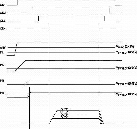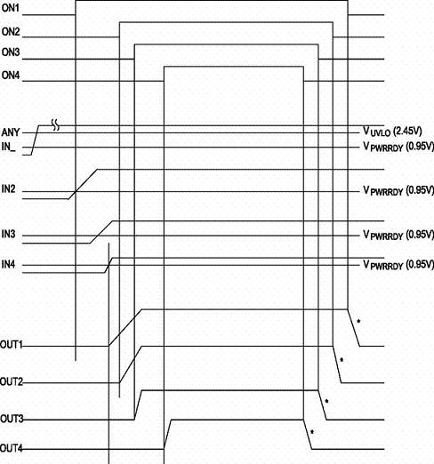 順序上電模式則根據(jù)設(shè)計者的要求,順序打開/關(guān)閉每一個通道。如果出現(xiàn)故障情況,則所有通道會被同時關(guān)閉,圖4是順序上電模式時序圖。