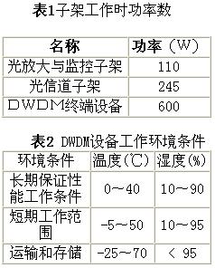 32X2.5GDWDM終端由一個光放大與監(jiān)控子架和兩個光信道子架組成。光放大及監(jiān)控子架和光信道子架采用靠背椅結(jié)構(gòu),子架的光、電信號均采用前出線,高度為11U。3U電源子架提供-48V電源,機(jī)架采用21″標(biāo)準(zhǔn)機(jī)架。子架工作時的功率參數(shù)和環(huán)境條件見表1與表2。