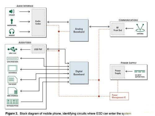 由于手機(jī)的設(shè)計(jì)對(duì)象是大眾消費(fèi)者,而且可在任何環(huán)境中使用,因此ESD很有可能會(huì)進(jìn)入其中的一個(gè)端口或I/O接口,并導(dǎo)致芯片組出現(xiàn)電氣不穩(wěn)定現(xiàn)象或完全損壞。圖2用于幫助說明不同電路該用什么樣的ESD保護(hù)技術(shù)。它表明,所有的電路都有可能為ESD進(jìn)入手機(jī)提供一個(gè)途徑。
