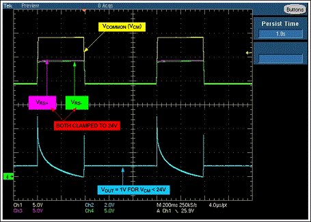 圖2是當(dāng)移走D1時,35V拋負(fù)載脈沖下放大器的輸出。施加電壓為電池標(biāo)稱電壓,所要求的輸出電壓為1V (輸入VSENSE = 50mV、增益 = 20)。出現(xiàn)拋負(fù)載電壓時,齊納管把輸入共模電壓鉗位在大約24V,放大器輸出經(jīng)過幾個短暫的波動后穩(wěn)定到0V。