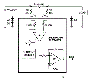 圖1. 該檢流放大器帶有保護(hù)電路(上部電路元件),適合于共模電壓高于30V的應(yīng)用。