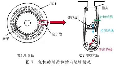 電機(jī)內(nèi)部的斷面如圖7 所示。電機(jī)有定子和轉(zhuǎn)子,定子內(nèi)有安放三相線圈的槽。如果放大槽的內(nèi)部,可以看到有許多的線圈(漆包線),各線圈對地之間、各相之間、線匝相互之間都有絕緣存在。通常對地、相間都有絕緣紙插入,而線匝之間沒有絕緣紙插入,它利用堅固的漆包線的漆層獲得絕緣。微浪涌電壓給這些絕緣全部帶來影響,這些絕緣損壞之中,線圈匝間損壞最多。表1 列出了有關(guān)電機(jī)內(nèi)部各絕緣部分承受的電壓值,也稱為電壓應(yīng)力,提供了用市電電源驅(qū)動電機(jī)和用變頻器驅(qū)動時相比較的資料。