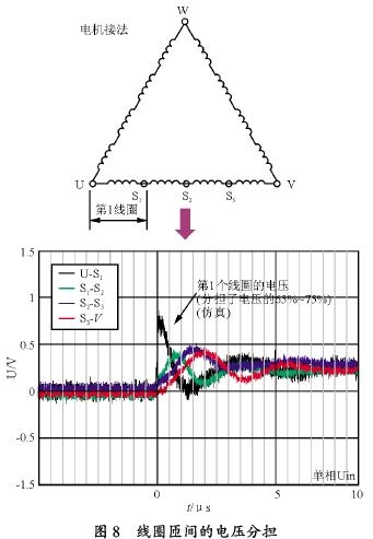 浪涌電壓滲入電機(jī)內(nèi)部的時候,線圈匝間究竟加上多少電壓,模擬結(jié)果如圖8所示。該模擬是將測量點(diǎn)放在電機(jī)的每一線圈上(電機(jī)槽內(nèi)的漆包線圈上),在U-V之間加上上升時間0.14 滋s 的浪涌電壓的測量的結(jié)果。U-S1之間是第1 線圈分擔(dān)的電壓,測得它分擔(dān)了全電壓65豫耀75%,而別的線圈S1-S2、S2-S3、S3-V 之間分擔(dān)了10豫耀20%,這是因為電機(jī)內(nèi)部的阻抗大,微浪涌電壓在逐漸衰減。