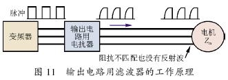 輸出濾波器的工作原理如圖11所示。微浪涌電壓是變頻器輸出脈沖上升時間出現(xiàn)的dv/dt 過大所引起,又由于阻抗不匹配被反射而發(fā)生。因此輸出電路使用濾波器,用于抑制dv/dt,也就是抑制了高頻成分因阻抗不匹配而造成的微浪涌。所以輸出濾波器是dv/dt抑制型濾器,這種濾波器在變頻器的調(diào)制頻率為15 kHz、接線長度為400 m時,能做出微浪涌電壓1 000 V以下的性能非常優(yōu)良的產(chǎn)品。不過,這種方式的濾波器為了讓逆變器的輸出電流通過電抗器,不得不做成大容量,造成濾波器的大型化、高價格化、大重量,有的達(dá)到50 kg以上,給用戶造成了實(shí)際負(fù)擔(dān)。