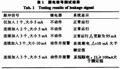 為了測試需要,我們設計了一個信號源,可以按照系統(tǒng)檢測信號的要求產(chǎn)生脈沖信號,以脈沖信號來模擬漏電信號。設定緩變電流動作值為100 mA,突變電流動作值為8 mA,當緩變電流累計值達到90 mA時,測試結(jié)果如表1所示。
