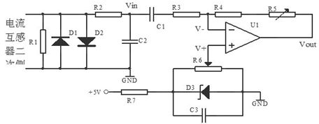 在檢測(cè)電流的大小時(shí),根據(jù)測(cè)試電流的周期(工頻)按照每個(gè)周期40個(gè)點(diǎn)進(jìn)行采樣,采樣一個(gè)周期后,根據(jù)電流互感器的衰減倍數(shù)和提升電壓的數(shù)值,通過(guò)軟件算法計(jì)算出實(shí)際的電流有效值。電路應(yīng)滿足如下條件,當(dāng)交流電流的瞬時(shí)值達(dá)到正向峰值時(shí),放大器輸出5V;當(dāng)交流電流的瞬時(shí)值達(dá)到負(fù)向峰值時(shí)放大器輸出0V。