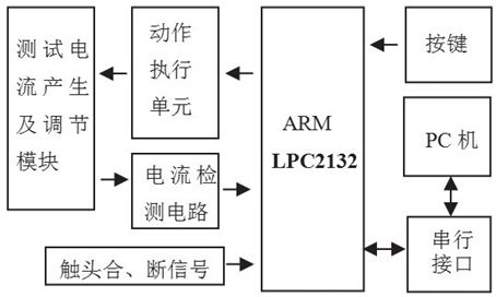 系統(tǒng)以LPC2132為核心,具有擴(kuò)展測(cè)試電流的產(chǎn)生和調(diào)節(jié)模塊、動(dòng)作執(zhí)行單元、電流檢測(cè)電路以及鍵盤(pán)等外圍設(shè)備。LPC2132是一個(gè)支持實(shí)時(shí)仿真和跟蹤32位ARM7TDMI-S核的微控制器,1個(gè)10位8路A/D轉(zhuǎn)換器,2個(gè)32位定時(shí)器/計(jì)數(shù)器,6路PWM單元輸出,2個(gè)硬件I2C接口和47個(gè)GPIO,2個(gè)16C550工業(yè)標(biāo)準(zhǔn)UART,以及多達(dá)9個(gè)邊沿或電平觸發(fā)的外部中斷。16kB的片內(nèi)靜態(tài)RAM和64kB的片內(nèi)Flash程序存儲(chǔ)器避免了LPC2132外擴(kuò)存儲(chǔ)器,簡(jiǎn)化了電路,提高了運(yùn)行速度。漏電保護(hù)器的動(dòng)作特性自動(dòng)測(cè)試系統(tǒng)結(jié)構(gòu)框圖如圖1所示。
