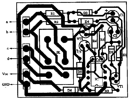 具體制作如下:先把功放輸出端與音箱的引線切斷,按圖2所示電路將引線頭a、b分別接功放的兩組輸出端,c、d分別接左、右聲道音箱:揚(yáng)聲器保護(hù)電路的電源只能從收放機(jī)中獲取,不可直接從汽車(chē)12 v電源中獲取,否則不起開(kāi)/關(guān)機(jī)保護(hù)作用;若是柴油車(chē)所配置的收放機(jī)(使用24 V電源),則要求增加一個(gè)降壓電路(見(jiàn)圖3所示),給揚(yáng)聲器保護(hù)電路供電,以免電源電壓過(guò)高損壞IC。