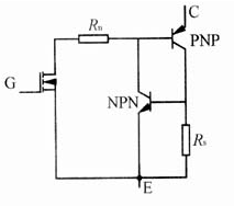 2)超出關斷安全工作區(qū)引起擎住效應而損壞擎住效應分靜態(tài)擎住效應和動態(tài)擎住效應。IGBT為PNPN4層結構,其等效電路如圖1所示。體內存在一個寄生晶閘管,在NPN晶體管的基極與發(fā)射極之間并有一個體區(qū)擴展電阻Rs,P型體內的橫向空穴電流在Rs上會產生一定的電壓降,對NPN基極來說,相當于一個正向偏置電壓。在規(guī)定的集電極電流范圍內,這個正偏置電壓不大,對NPN晶體管不起任何作用。當集電極電流增大到一定程度時,該正向電壓足以使NPN晶體管開通,進而使NPN和PNP晶體管處于飽和狀態(tài)。于是,寄生晶閘管導通,門極失去控制作用,形成自鎖現(xiàn)象,這就是所謂的靜態(tài)擎住效應。IGBT發(fā)生擎住效應后,集電極電流增大,產生過高功耗,導致器件失效。動態(tài)擎住效應主要是在器件高速關斷時電流下降太快,dvCE/dt很大,引起較大位移電流,流過Rs,產生足以使NPN晶體管開通的正向偏置電壓,造成寄生晶閘管自鎖[2]。
