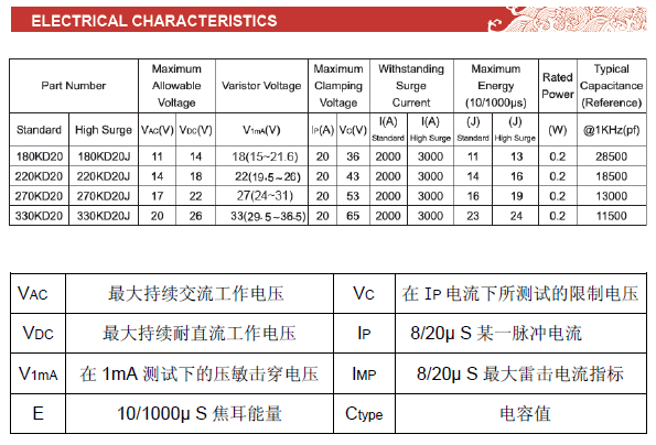 • 電壓規(guī)格從18V~1800V,突波耐電流能力從幾百安培到幾十千安培不等,單體最大可達(dá)70KA