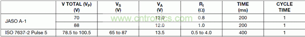 美國的ISO-7637-2 Pulse 5和日本的JASO A-1針對(duì)14V動(dòng)力總成的仿真條件如下表。