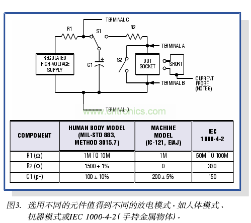 有兩種方法一均符合上述要求一已被設(shè)備制造商廣泛采用,來測試I/O端口的ESD防護(hù)能力(圖3)第一種方法修改自Method 3015.7 > MIL-STD-883它采用了與原來方法相同的電路模型和波形,但只將ESD脈沖施加于器件的I/o引腳。這種方法的口的是模擬已安裝于線路板并運行于口標(biāo)系統(tǒng)中的Ic所遭遇的故障電流。