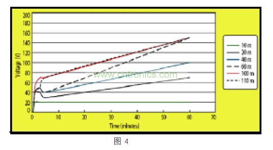 隨之而來的高能量放電可能會損壞連接器,變壓器電路,或以太網(wǎng)收發(fā)器。雙絞線電纜表現(xiàn)像一個(gè)存儲電荷的電容器。有研究證明,未連接到終端的雙絞線電纜可能會積累幾百伏的電荷。此外,在一個(gè)小時(shí)內(nèi),完全放電的電纜可以積累其所能積累總電荷的一半。一旦有了靜電,高品質(zhì)的電纜保留其所帶靜電的時(shí)間可以超過 24 小時(shí)。下面圖 4展示了不同長度的 CAT5 電纜積累靜電如何隨著時(shí)間而變化。由于較長的電纜有容量來存儲更多的電荷,電纜長度超過 60m 的系統(tǒng)應(yīng)采取額外的 CDE 預(yù)防措施。