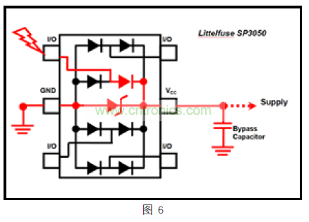 至于常用 TVS 二極管陣列、5 針、VCC 的中其余引腳,Littelfuse 還建議,這應(yīng)連接到本地電源,如 5V,3.3V等(注:應(yīng)當(dāng)心,以確保保護(hù)裝置或 VRWM 的對峙電壓遠(yuǎn)高于電源電壓,以防止激活或打開內(nèi)部 TVS 二極管。)