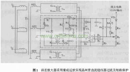 在擯棄電流采樣、放大和執(zhí)行等多個環(huán)節(jié)的情況下,將單結(jié)晶體管移相觸發(fā)器中的晶體管誤差放大器改為集成運算放大器,就可實現(xiàn)晶閘管直流穩(wěn)壓器的過流及短路保護,簡化了電路結(jié)構(gòu),并提高了整機的穩(wěn)定可靠性能和AC - DC變換效率。