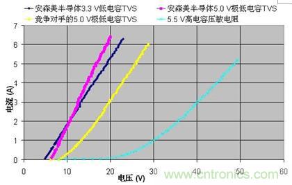 圖3的屏幕截圖就是這樣一個(gè)范例。從圖中可以看出,安森美半導(dǎo)體的TVS元件可以迅速將ESD應(yīng)力降低,即從8 kV靜電電壓鉗位到5至6 V的水平;但壓敏電阻的曲線則下降得很慢,而且無(wú)法降到很低的水平。該曲線表明,TVS器件的恢復(fù)時(shí)間非常短,經(jīng)過TVS器件泄漏到后面電路的能量也非常少,特別適合于便攜式設(shè)備的應(yīng)用。