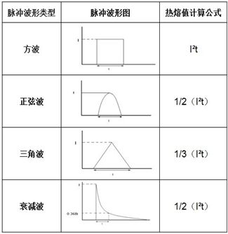 表2是幾種常見脈沖波形的計(jì)算公式。脈沖電流的熱熔值可以通過對脈沖電流波形數(shù)據(jù)的積分計(jì)算得到。