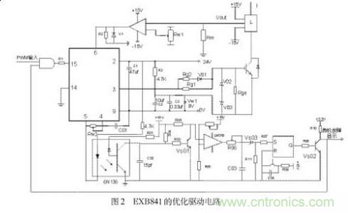 如圖2所示,用外接8V穩(wěn)壓管Vw1代替驅(qū)動芯片內(nèi)部的穩(wěn)壓管Vz2,在穩(wěn)壓管兩端并聯(lián)了兩個(gè)電容值分別為105μf和0.33μf的去耦濾波電容。為防止柵極驅(qū)動電路出現(xiàn)高壓尖峰,在柵射極間并聯(lián)了反向串聯(lián)的16V(V02)和8V(V03)穩(wěn)壓二極管。為了改善控制脈沖的前后沿陡度和防止震蕩,減小IGBT 集電極的電壓尖脈沖,需要在柵極串聯(lián)電阻Rg。柵極串連電阻Rg要恰當(dāng),Rg過小,關(guān)斷時(shí)間過短,關(guān)斷時(shí)產(chǎn)生的集電極尖峰電壓過高;Rg過大,器件的開關(guān)速度降低,開關(guān)損耗增大。優(yōu)化電路采用了不對稱的開啟和關(guān)斷方法。在IGBT開通時(shí),EXB841的3腳提供+16V的電壓,電阻Rg2經(jīng)二極管Vd1和Rg1并聯(lián)使Rg值較小。關(guān)斷時(shí),EXB841內(nèi)部的V5導(dǎo)通,3腳電平為0,優(yōu)化驅(qū)動電路在IGBT的E極提供-8V電壓,使二極管V01截止,Rg= Rg1具有較大值。并在柵射極間并聯(lián)大電阻,防止器件誤導(dǎo)通。