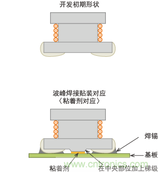 在 生產(chǎn)第一代LQN5N及第二代LQH32M時(shí),雖會(huì)對(duì)部分混合IC基板進(jìn)行回流焊接,但一般是對(duì)裝有插腳零部件的基板背面進(jìn)行波峰焊接。其貼裝方法是將膠 粘劑涂在基板焊盤的中央部或貼片元件電極的中央部,待其固化后將其投入波峰焊接槽。與CR貼片元件相比,體積較大的LQH系列在受到焊錫流動(dòng)阻力后易發(fā)生 脫落,因此在電極間中央部位設(shè)計(jì)了突起(稱為梯級(jí)磁芯)?,F(xiàn)在看來的話,是反向支架形狀。至今再也見不到這種結(jié)構(gòu)。