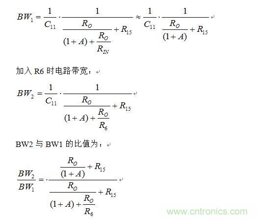 從上式看出,當(dāng)A較小時,R6的加入確實有擴(kuò)展帶寬的作用,但R6的取值不能太大。當(dāng)R6取得很大時,x=R0/R6趨近于0,BW2/BW1趨近于1,也就不能擴(kuò)展帶寬了。