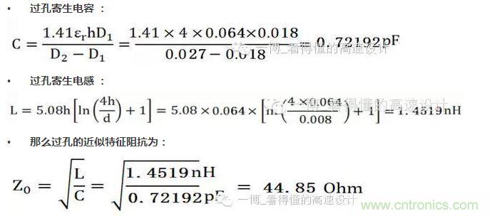 此公式是將過孔等效為傳輸線的模型來計算的,如果常規(guī)我們單端信號是50歐姆的特征阻抗,過孔的阻抗如上計算約為45歐姆,拉低了整體的特征阻抗,所以說呈現(xiàn)容性效應(yīng)。