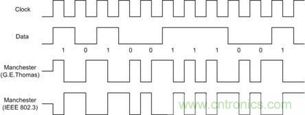 數(shù)字編碼采用曼徹斯特編碼,首先傳輸MSB(最高有效位)。曼徹斯特編碼:從高位轉(zhuǎn)移到低位(下降沿)為二進制1,從低位轉(zhuǎn)移到高位(上升沿)為二進制0,即圖 1的Manchester G.E.Thomas。