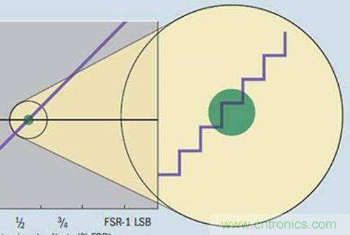 A/D轉(zhuǎn)換器的分辨率被定義為輸入信號值的最小變化,可通過一次計數(shù)改變數(shù)字輸出值。就理想的A/D轉(zhuǎn)換器而言,傳遞函數(shù)呈階梯狀,且每個步階寬度等于分辨率。但使用較高分辨率(16位或16位以上)的系統(tǒng)時,傳遞函數(shù)的響應(yīng)和理想的響應(yīng)之間將存在較大的偏差。這是因為由A/D轉(zhuǎn)換器及驅(qū)動器電路產(chǎn)生的噪聲可降低該轉(zhuǎn)換器的分辨率。