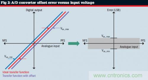 偏移誤差(VOS)。該誤差是A/D轉(zhuǎn)換器實際傳遞曲線和理想傳遞曲線之間的恒定差異(見圖2)。它是測定的數(shù)字輸出,通過把A/D轉(zhuǎn)換器輸入端短接到接地(GND)獲得。
