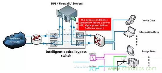OBP旁路保護系統(tǒng): 光旁路保護系統(tǒng)(Optical Bypass Protection system)是一種應(yīng)用于光纖通信領(lǐng)域并能自動繞過故障網(wǎng)絡(luò)節(jié)點的智能光路切換系統(tǒng),能自動識別網(wǎng)絡(luò)節(jié)點供電狀態(tài)及光信號輸出狀態(tài),當(dāng)本地光設(shè)備出現(xiàn)故障(包括電源中斷、硬件或軟件故障等)后,能夠瞬間切換到旁通光路,通訊線路將繞過本地設(shè)備(即故障節(jié)點),從而能避免由于該故障節(jié)點而發(fā)生全阻障礙,保證系統(tǒng)連通正常。
