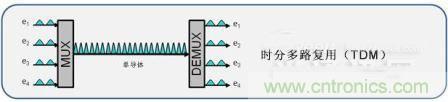 時(shí)分復(fù)用是一種通過使用越來越小的時(shí)間增量來傳輸更多的數(shù)據(jù)的方式,并且將較低數(shù)據(jù)率的信號(hào)復(fù)用進(jìn)較高速度的復(fù)合信號(hào)中。通過時(shí)分復(fù)用,較低速度的電信號(hào)交錯(cuò)在時(shí)間中,并在較快的復(fù)合光路上傳輸。因此,所得的較高數(shù)據(jù)速率將是單個(gè)輸入速率的數(shù)倍。