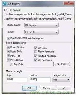 系統(tǒng)需要能夠以與 DXF 參數(shù)設(shè)置類似的方式,來控制 IDF 文件中將包含的內(nèi)容,如圖 6 中所示。如果某些元器件沒有高度信息,IDF 導(dǎo)出能夠在創(chuàng)建過程中添加缺少的信息。