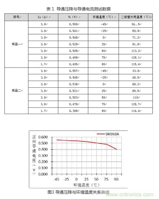 在我們開發(fā)產(chǎn)品的過程中,高低溫環(huán)境對電子元器件的影響才是產(chǎn)品穩(wěn)定工作的最大障礙。環(huán)境溫度對絕大部分電子元器件的影響無疑是巨大的,二極管當然也不例外,在高低溫環(huán)境下通過對SM360A的實測數(shù)據(jù)表1與圖3的關系曲線可知道:二極管的導通壓降與環(huán)境溫度成反比。在環(huán)境溫度為-45℃時雖導通壓降最大,卻不影響二極管的穩(wěn)定性,但在環(huán)境溫度為75℃時,外殼溫度卻已超過了數(shù)據(jù)手冊給出的125℃,則該二極管在75℃時就必須降額使用。這也是為什么開關電源在某一個高溫點需要降額使用的因素之一。