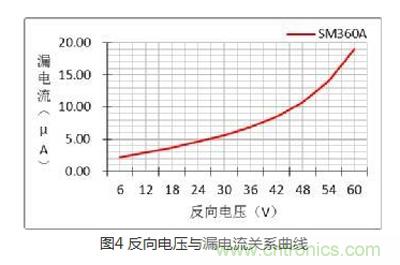 在二極管兩端加反向電壓時,其內(nèi)部電場區(qū)域變寬,有較少的漂移電流通過PN結(jié),形成我們所說的漏電流。漏電流也是評估二極管性能的重要參數(shù),二極管漏電流過大不僅使其自身溫升高,對于功率電路來說也會影響其效率,不同反向電壓下的漏電流是不同的,關系如圖4所示:反向電壓愈大,漏電流越大,在常溫下肖特基管的漏電流可忽略。